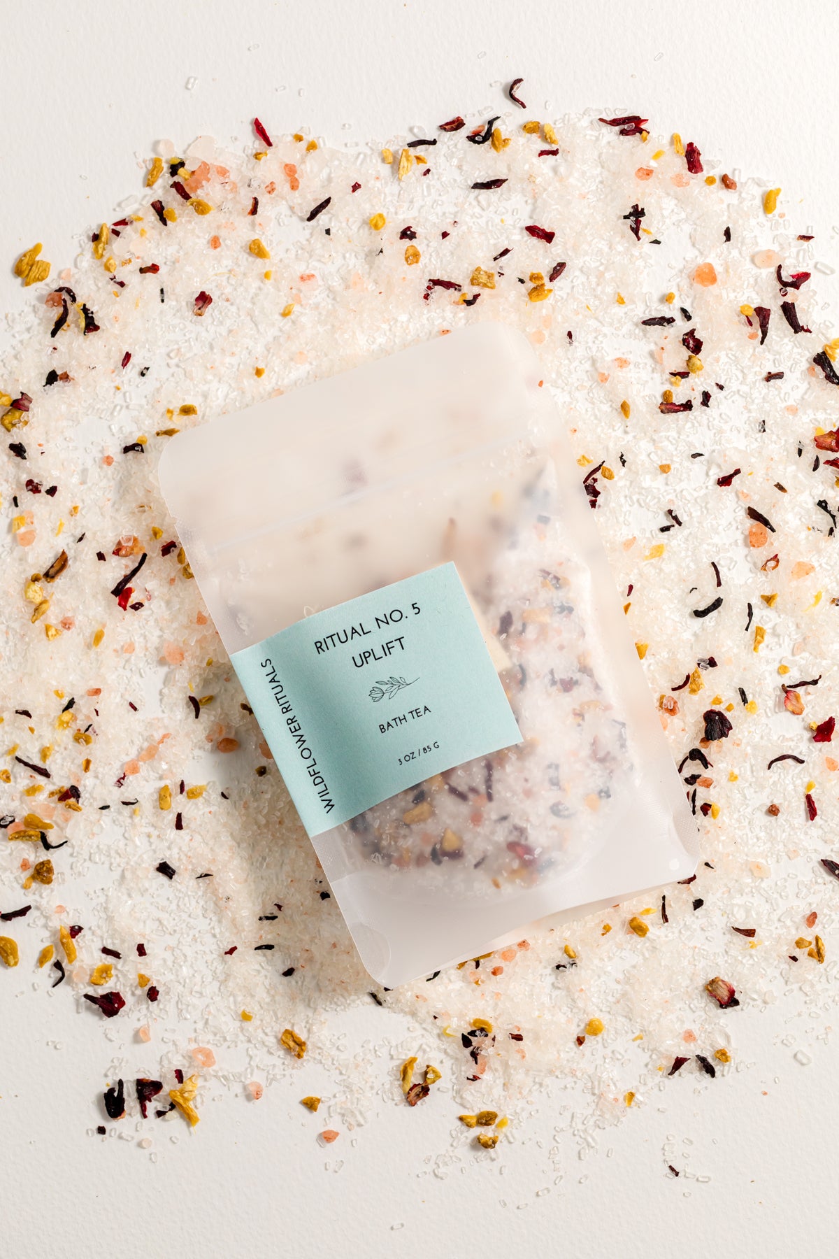 Ritual No. 5 Uplift bath tea blend contains bright and crisp notes of sweet orange and lemon. Lemon is commonly used to stimulate the immune system and has been known to foster concentration and self-expression. Epsom salts are blended into this herbal bath tea and have been used for soothing and muscle relaxation.